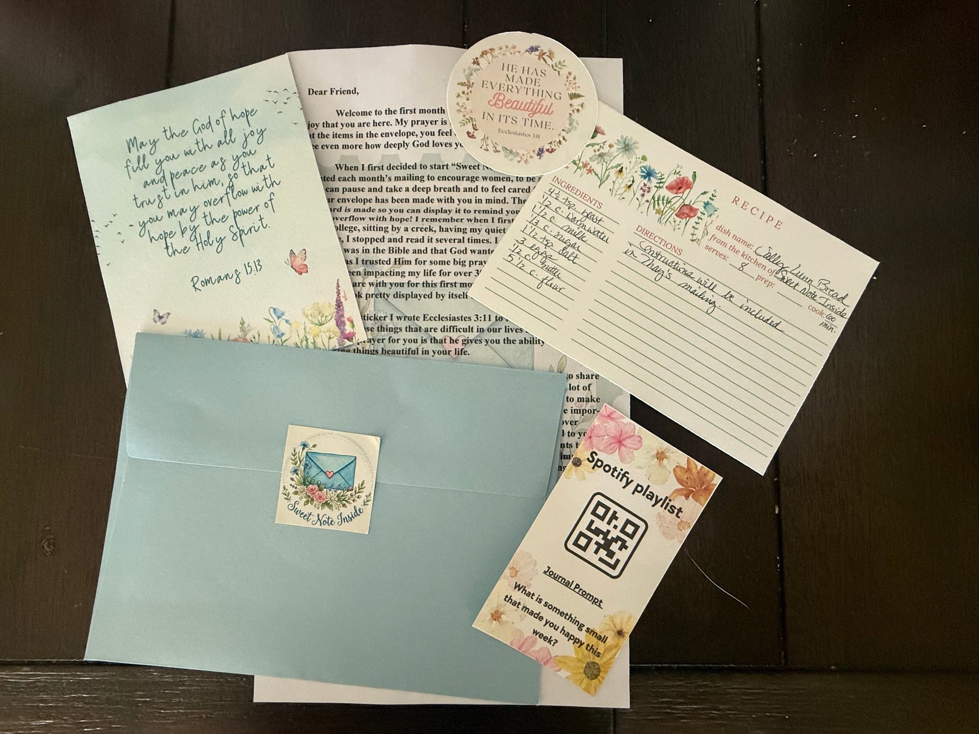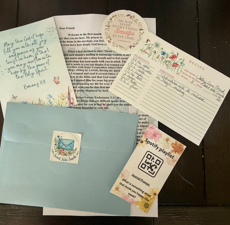 Sweet Note Inside is a monthly mail club where you’ll receive a thoughtfully curated envelope you can hold--one that is filled with Scripture, collectible keepsakes, and encouragement.